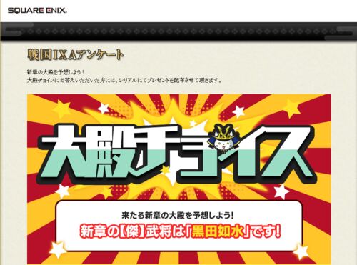 お疲れサマンサです! 何か告知来てたので自分用に書いておきますw まずは大殿チョイス。 お知らせは下記URLからどうぞ。 戦国IXA(イクサ)公式サイト - オンライン戦国体感ゲーム - お知らせ トップページの、クイズページというところから飛べますね…